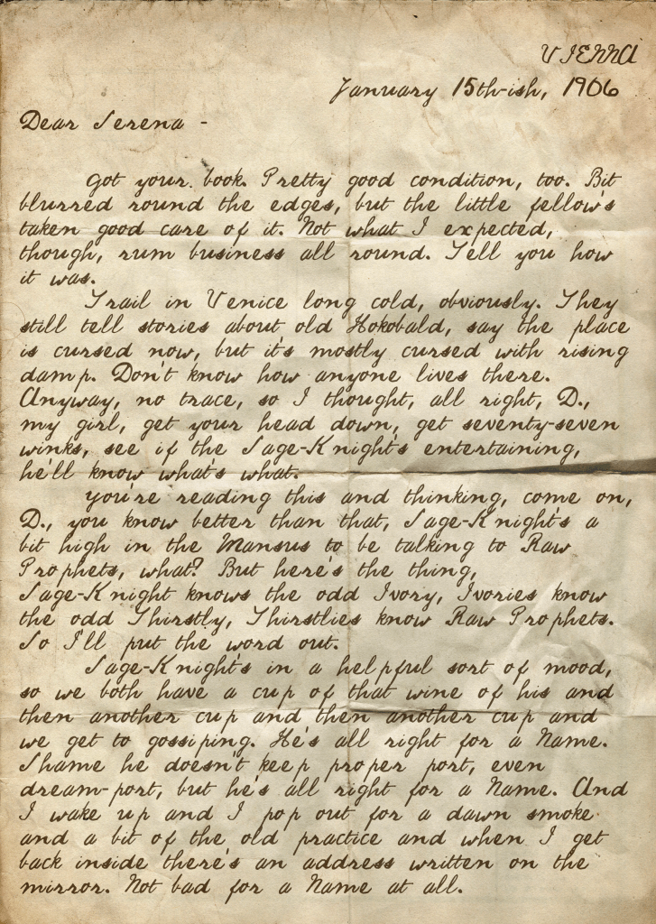 Trail in Venice long cold, obviously. They still tell stories about old Hokobald, say the place is cursed now, but it’s mostly cursed with rising damp. Don’t know how anyone lives there. Anyway, no trace, so I thought, all right, D., my girl, get your head down, get seventy-seven winks, see if the Sage-Knight’s entertaining, he’ll know what’s what.