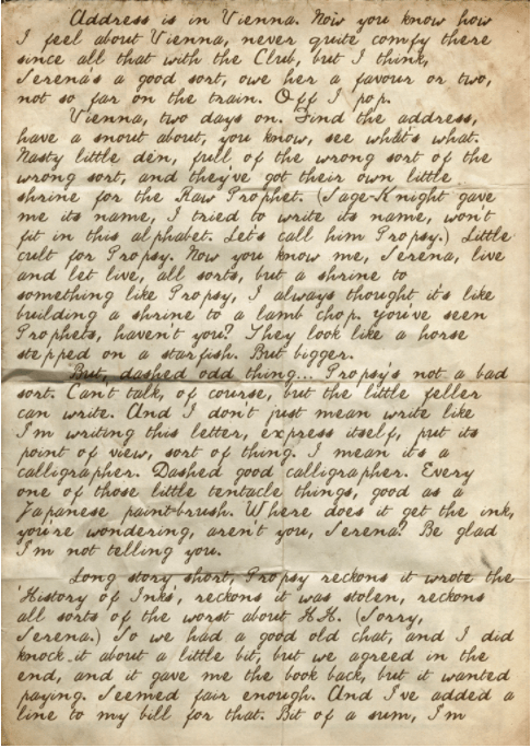 But, dashed odd thing… Propsy’s not a bad sort. Can’t talk, of course, but the little feller can write. And I don’t just mean write like I’m writing this letter, express itself, put its point of view, sort of thing. I mean it’s a calligrapher. Dashed good calligrapher. Every one of those little tentacle things, good as a Japanese paint-brush. Where does it get the ink, you’re wondering, aren’t you, Serena? Be glad I’m not telling you.