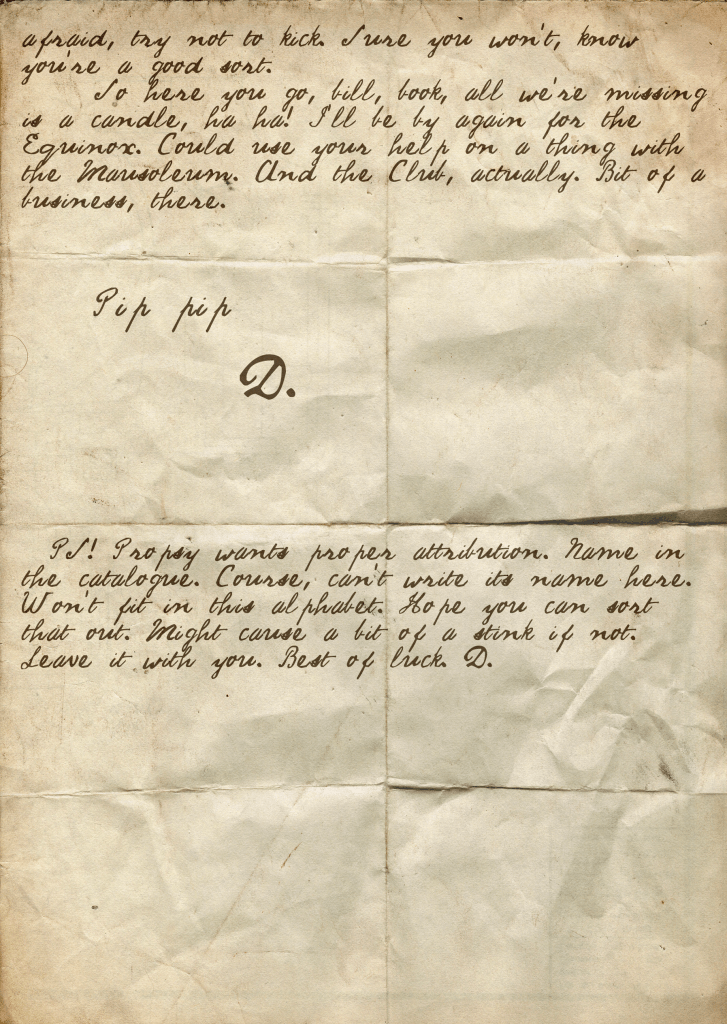 So here you go, bill, book, all we’re missing is a candle, ha ha! I’ll be by again for the Equinox. Could use your help on a thing with the Mausoleum. And the Club, actually. Bit of a business, there.