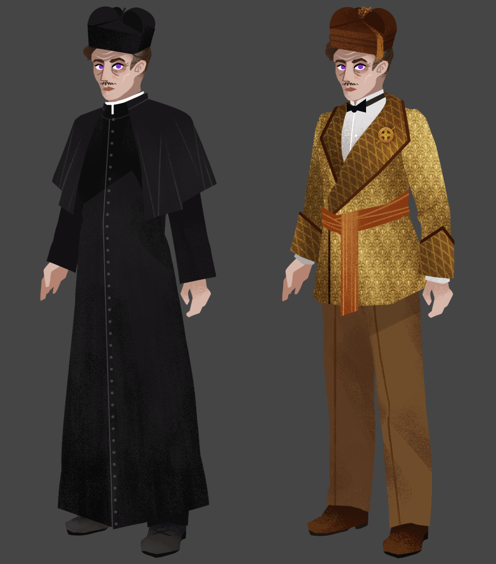 For now, please entertain yourselves with two new outfits for Spencer: one recalling his brief time as a priest of the Church of the Unconquered Sun, and the other from his time as ‘Father Brass’, his semi-successful stage magician persona.