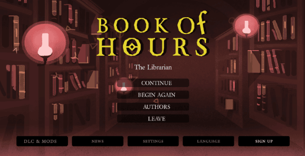 Anyway! On to BOOK OF HOURS. We reached an important moment in the life of any game’s development, also known as the First Time You Have A Main Menu Screen. The below is janky and seriously placeholder (we plan to rework a remote, saudade Hush House version later down the line), but it already makes BoH feel more like a real game. Exciting!