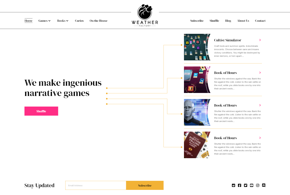 We’ve been talking a lot about the Factory Records catalogue (the cats are definitely each getting their own catalogue number) and the SCP Foundation, which reminds me of the Cultist Simulator wiki if it had gotten drunk and fallen over. So we’re working on a new WF.biz that leads people through a variety of info, lore and strange pages with ‘artist’s impressions’ of centipedes on them, in the hopes it’s a more interesting (and easy!) place to browse with the new design. I expect this live at the end of the month, but we’ll confirm when we know for sure!