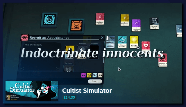 (Fun fact: if you search by the ‘Lovecraftian’ microtrailer tag, Cultist is currently wedged between Lust for Darkness and Lobotomy Corporation. Cosy.)