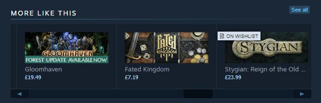 I’ve already discussed search suggestions above, but here’s one CTR-specific thought to add. People are specifically searching for your game in Steam, so this absolutely should convert well unless you’re doing something horribly wrong on your store page. I suspect conversion rate is lower over time than the genre pages or ‘More Like This’ section because people are quite likely to wishlist after hearing about a game if it’s not currently on sale. Genre pages are most likely to send traffic to your store page if you’re on sale, because that’s when you’re likely to get those extra feature slots at the top of the page. That’s my two cents, anyway.
