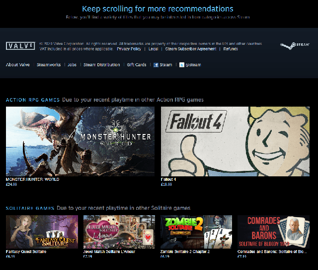 The recommendation feed is that whole section at the bottom of the Steam home page with a variety of recommendations by tags, playtime, wishlist, curators and friends’ reviews. They’re not the high-profile recommendations you see in the top carousel, or the variety of other, more foregrounded features in the top half of the home page. They’re the nitty-gritty bits at the bottom for the jaded Steam browser who’s not yet seen anything that caught their eye. It’s still front page traffic, though, so it’s logical this ranks high on impressions. If there’s a moral here, it’s to use whatever you can (including Curator Connect!) to get your game appearing as many times as possible in different subsections here.