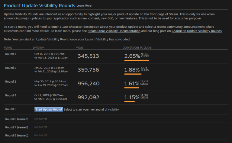 Similar to the vital importance of your initial MMR (see Lauren Clinnick and Matt Trobbiani on MMR here), this data implies that success breeds success. We can put out increasingly less interesting content and still see more people click through, even though CTR went down, because we’re continually growing an audience of wishlisters on Steam after a successful launch. This isn’t a recommended strategy – I’m going to try an be more interesting in 2020! – but it’s significant. And this is before you get into those ‘earned’ Visibility Rounds, which I believe are awarded at Steam’s discretion based on generated revenue.