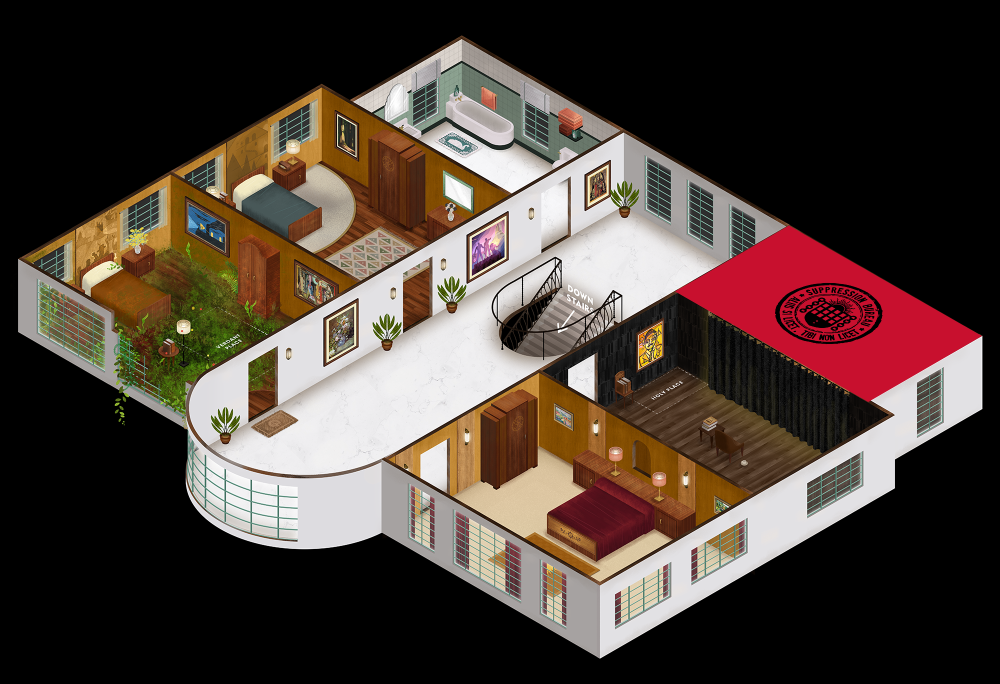 The upstairs is a place for crafting (note the Verdant and Holy Places – with one other opportunity hidden beneath the Suppression Bureau’s censored section), dressing (note your gigantic wardrobe) and sleeping. Your room’s the middle on the left, decorated with some slightly troll-y touches by Dr Aubière. No prizes for guessing which is the room used by Rodia – the Greek singer-patriot rendered stationary by the Plague of Leaves – but many points if you figured that the largest, plushest room in the bottom right corner is Strathcoyne’s, because of course it is. Please make sure to set your alarm for the middle of the night so you can sneak into people’s rooms and see him sleep. Creepy? Yes – I told you you didn’t have to be nice! But also rewarding because you get to see Strathcoyne look cute: