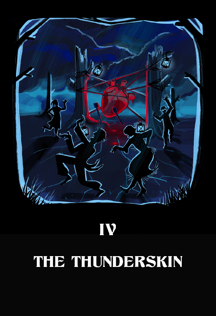 The Thunderskin is the Heart Relentless, who does not permit conclusion. With the Mother of Ants, he is among the chiefest Gods-from-flesh. He cannot be stilled; he demands the dance; he is beaten, like a drum. Red and blue are his colours. He is heard in the Wood below the world.
